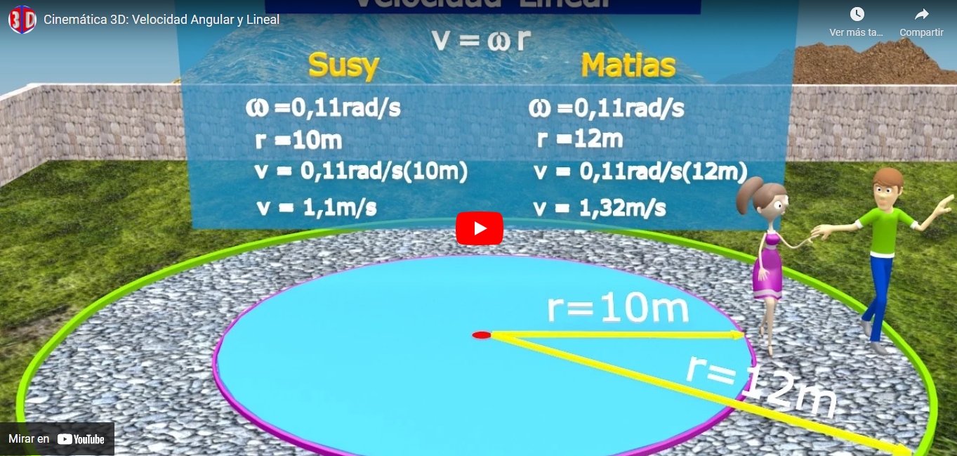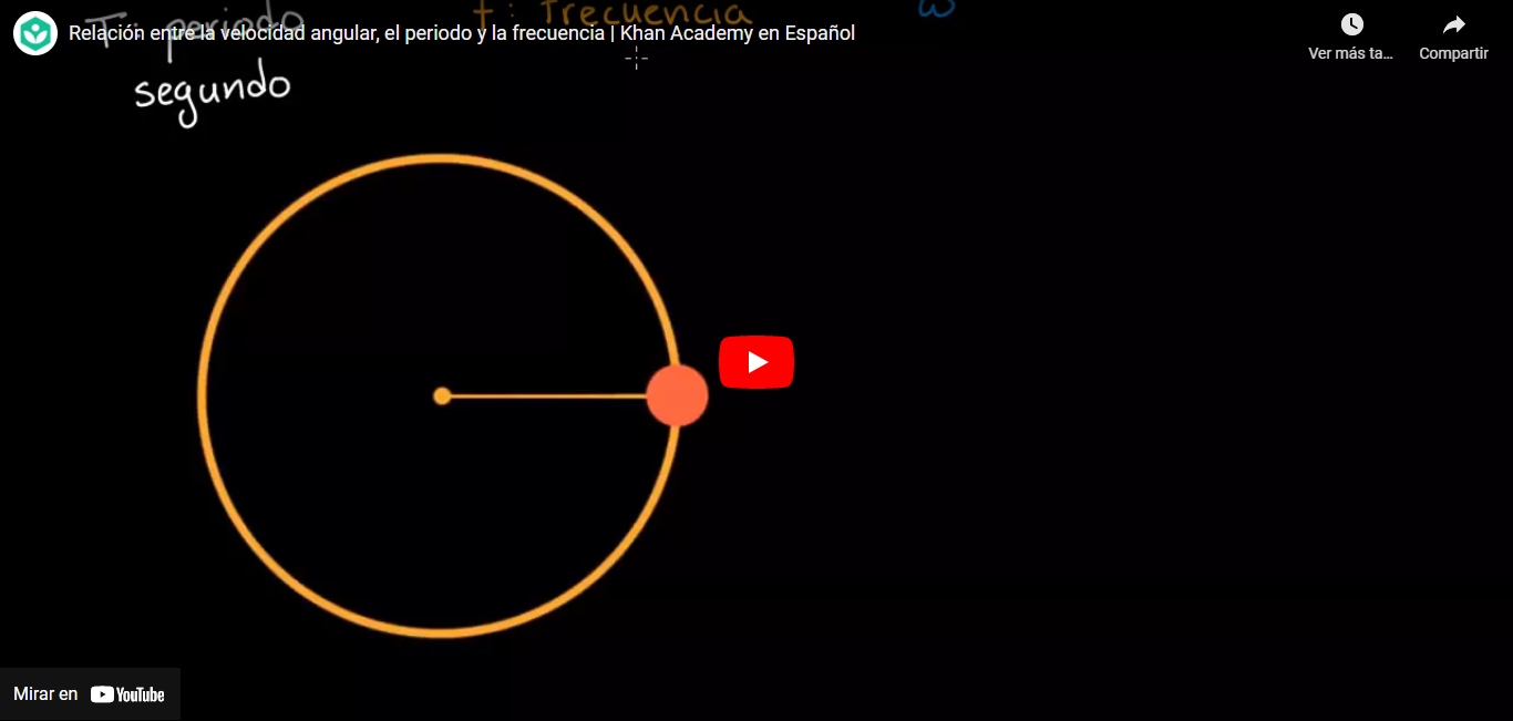 Indicaciones: 1.- Ver y analizar las veces que creas necesarias los siguientes videos: 2. Escribir un resumen de cada uno de los temas explicados en los videos de Velocidad lineal y angular y el de Periodo-frecuencia y su relación con la velocidad angular. 3. Realizar un formulario de las ecuaciones explicadas en los videos. 4. Conjunta la información de tus resúmenes y formularios en un archivo y nombra de la siguiente manera: ApellidosNombre-Resumenes-Vlinealangular Por ejemplo: MoralesEspinozaArleth-Resúmenes-Vlinealangular. | Videos: 1.- Cinemática 3D Velocidad Angular y Lineal Publicado el 26 de jun 2014. Link: https://www.youtube.com/watch?v=17ABwb93Q58