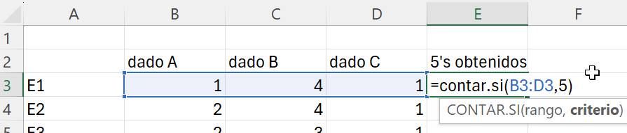 Donde B3:D3 corresponde al rango donde se encuentran los resultados simulados de los 3 dados y el 5 es el criterio que se debe cumplir para contar.
