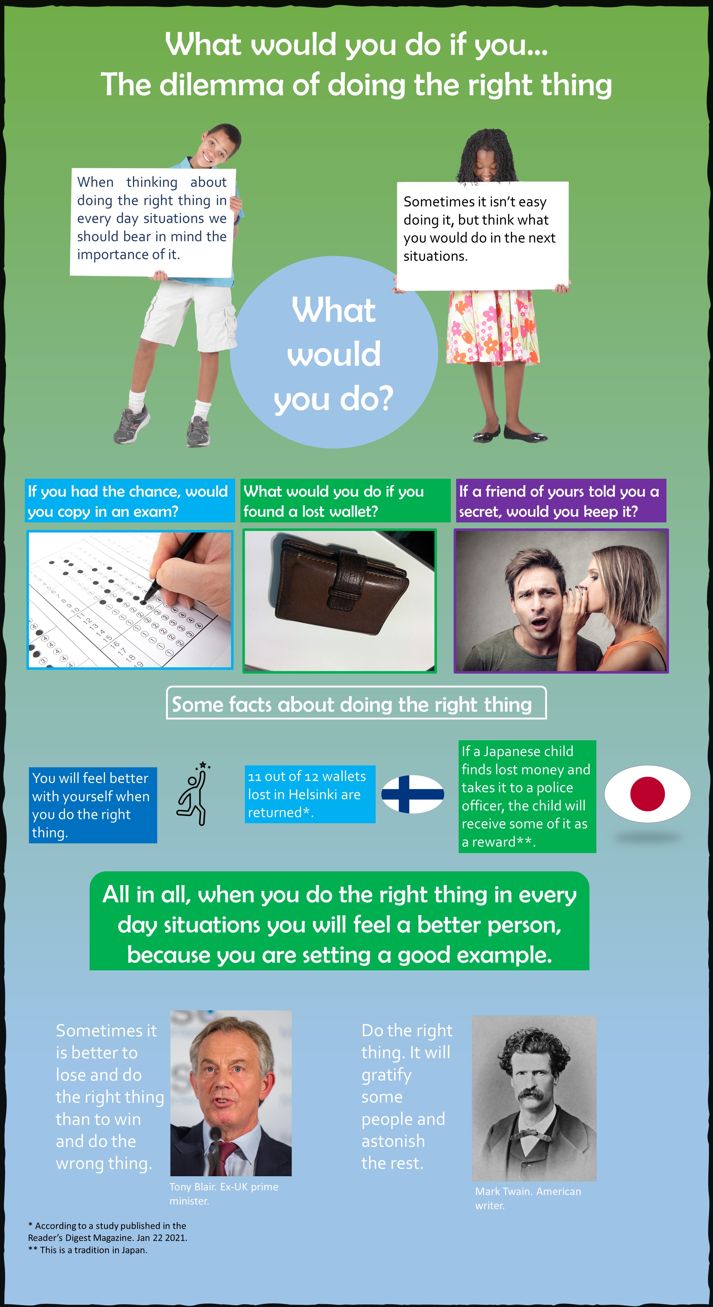 Instructions: 1. Check the example poster as a guide to make your own poster. In your poster you will show a moral or legal dilemma in everyday life you have learnt about . 2. Read the articles in the links. Choose one dilemma and write a summary. (Each team will create their poster based on that summary). 3. In teams, create your poster with any image editor. The poster will show the moral or legal dilemma you chose. Check the rubric for the poster. The elements to be evaluated are : Precise information about the topic. The sentences must include at least three of the conditionals previously reviewed in the unit (zero, first, second). The poster must include some connectors of cause/consequence. The poster must be 60 cm wide and 110 cm high. The poster must be visually attractive and include at least one source of information. The poster must include quotes from historical characters (they can be politicians, writers, famous people, etc.) 4. Save your work as a JPG or PDF file and upload it here. Name it as the example: Aréchiga_Ema_poster (Last name_Name_poster) |