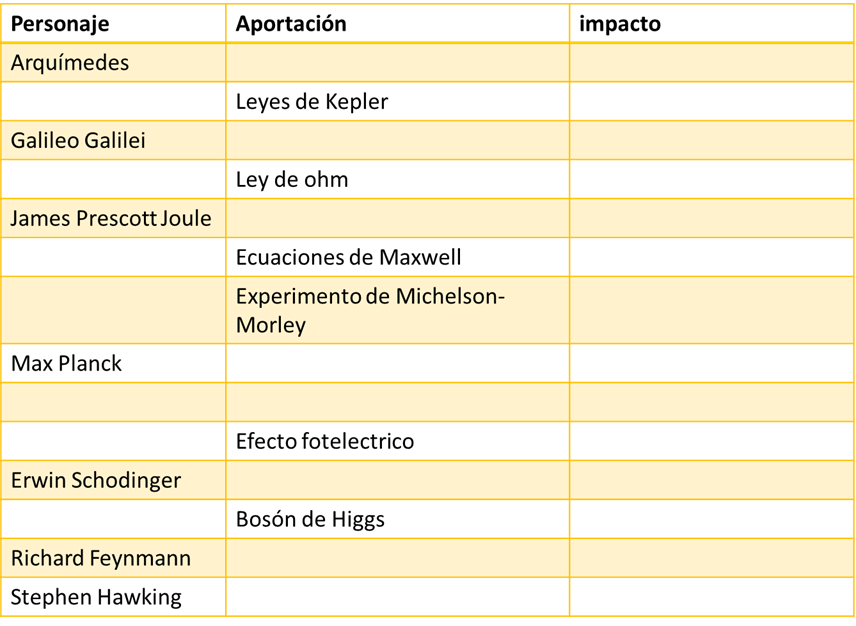 Elabora una línea de tiempo que contenga los desarrollos más importantes en la historia de la física. No te olvides incluir a los personajes, fechas y teorías, leyes o descubrimientos que dieron pie a establecer la relación entre la ciencia y la tecnología. A modo de guía se te presenta una tabla que te ayudará en la elaboración de la línea de tiempo. Completa la tabla y añade la información que consideres necesaria.