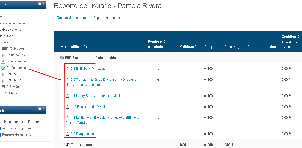 1.- Localiza el bloque de Navegación y da clic en Calificaciones Verás una tabla llamada Reporte de usuario con todas las tareas, exámenes y actividades que hay en el curso en letras color azul. Observa que si los espacios de Calificación o Retroalimentación están en blanco, es porque aún no las realizas o entregas.