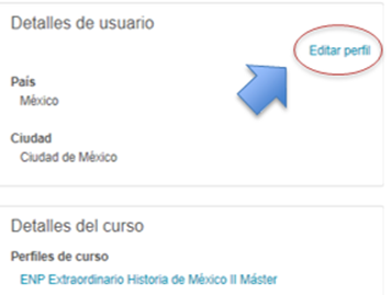1. Dirígete a la página principal del curso, y en la parte superior derecha da clic en la flecha que aparece junto al nombre del usuario. 2. Haz clic sobre la flecha, se desplegará una lista de opciones, elije la opción “Perfil” 3. Dar clic en “Editar perfil”, para modificar la información en los espacios correspondientes. 4. Llene el formulario con los datos correspondientes. 5. Finalmente, seleccione la opción “Actualizar información personal” para que los cambios queden guardados